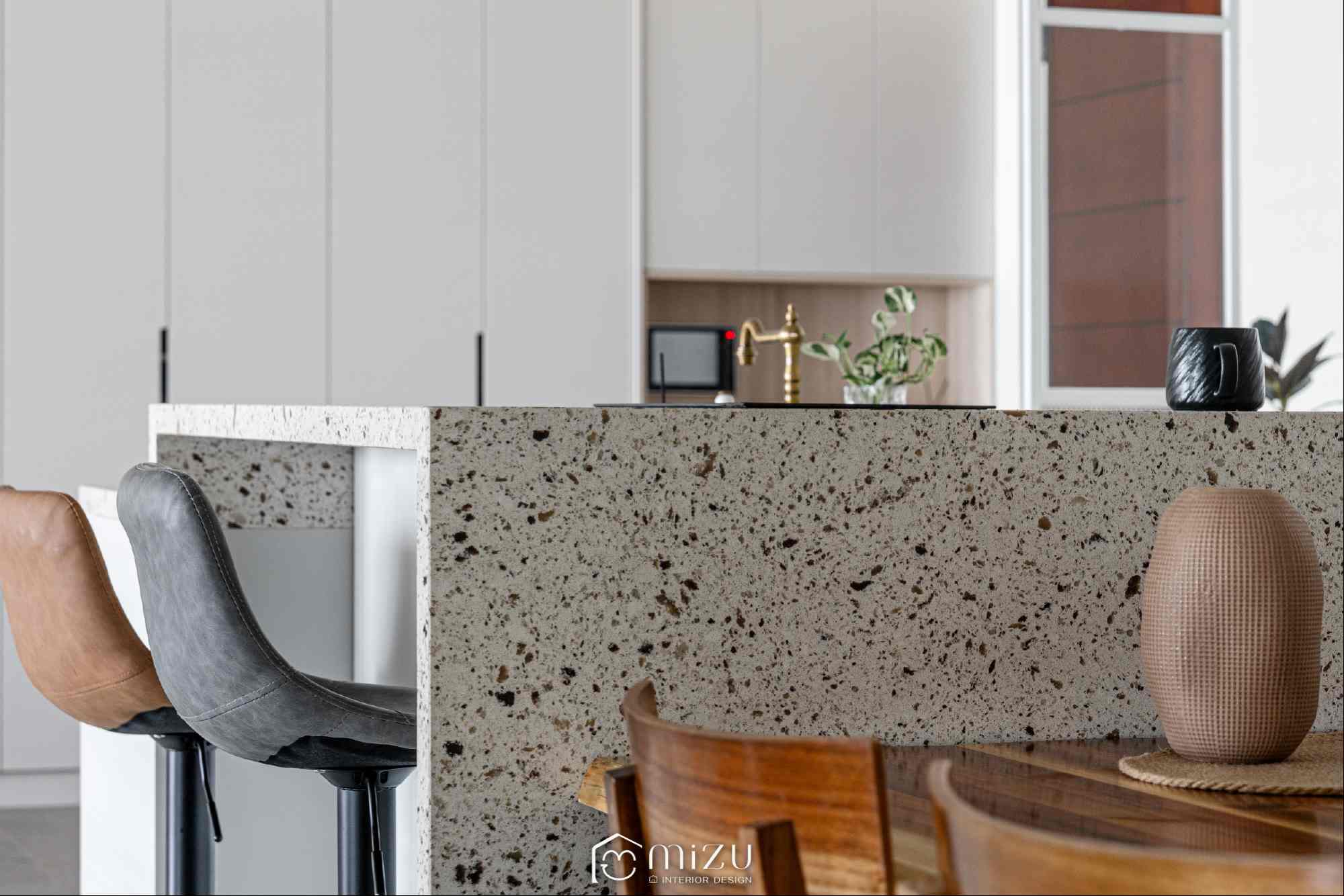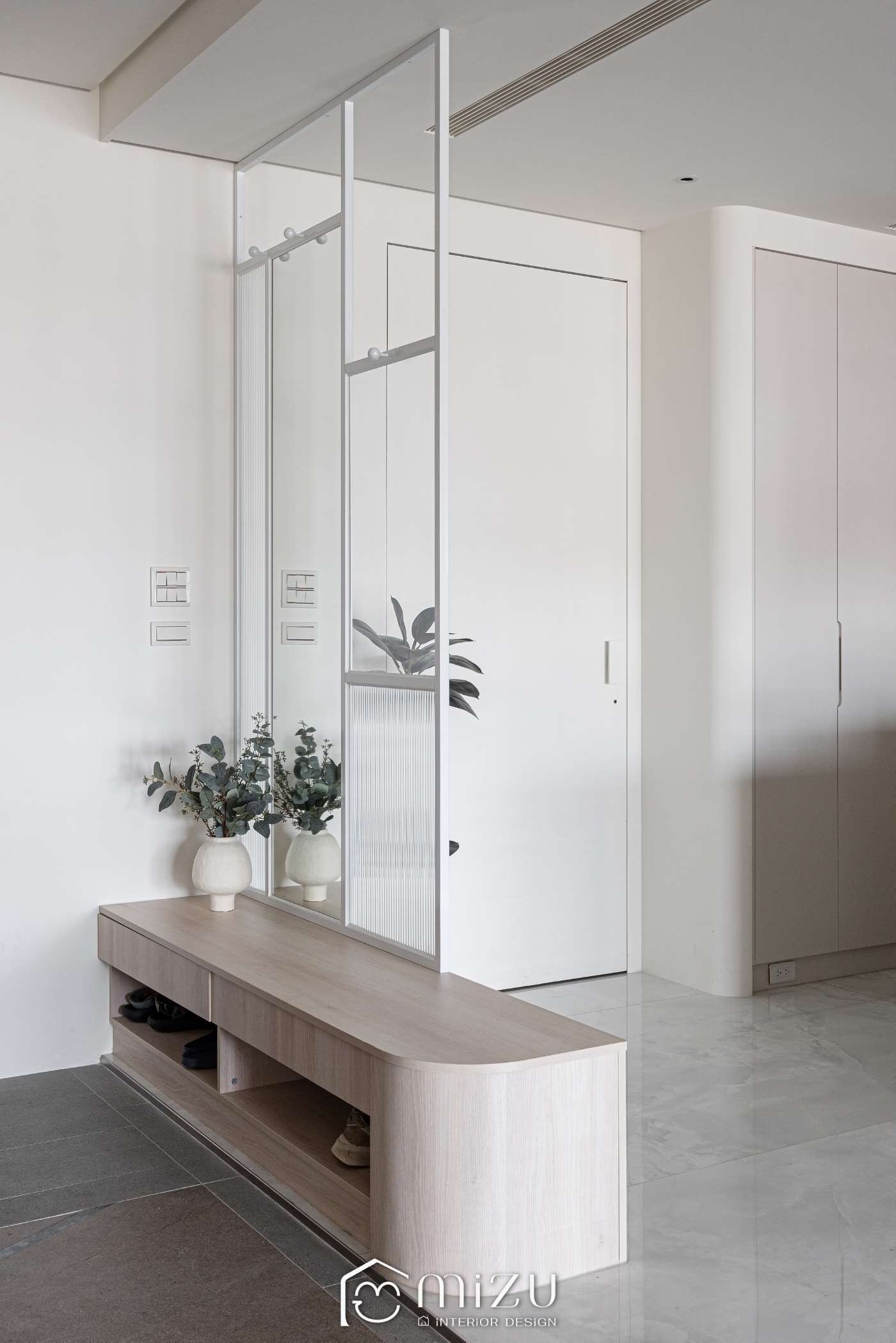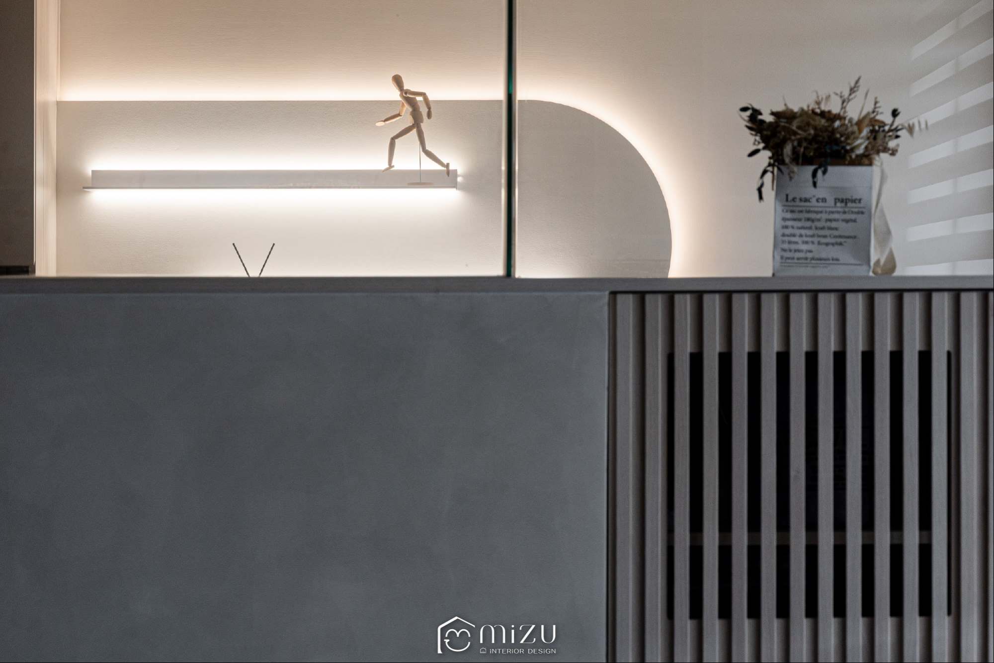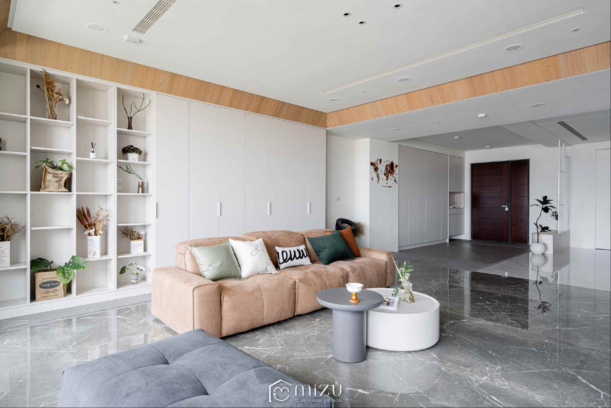 A modern, refined tone.Light and texture move gently across the space—